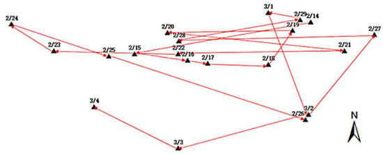 CGO software was adopted to process the Antarctic GPS monitoring data and the obtained ice-shelf-motion measurement results. The GPS monitoring data of the ice shelf were imported into ArcGIS (a geographic information system platform), and the position change is shown in Figure 10. It can be seen from Figure 10 that the position of the ice shelf was changing every day, and the daily moving distance varied. From the small scale, the movement direction of the ice shelf did not occur strictly in a certain direction. During the observation period, the minimum moving distance was 0.1395 m on 22 February 2012, the maximum moving distance was 10.433 m on 16 February 2012, and the average daily moving distance was 3.702 m.