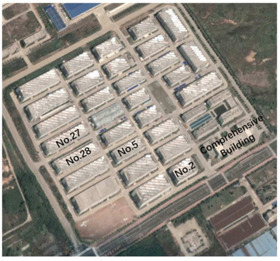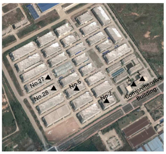 Using the improved devices, a glacier movement simulation experiment was carried out in Chizhou City, Anhui Province, China. The test site was the Electronics Industrial Park in the Economic Development Zone of Chizhou City, where there are many factories. Two improved GPS monitoring devices were installed on the roof of the factory building. The park is shown in Figure 12, a picture taken on Google Maps to show the distribution of different test points in the test area.