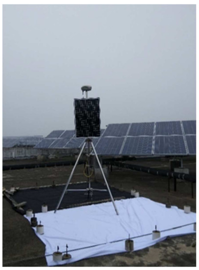 Considering the validation of the later and multi-source satellite remote sensing data, a cloth of nearly 5 m × 5 m (area) was laid under the GPS equipment to improve the recognition of the equipment on the image. The on-site equipment installation is shown in Figure 13.