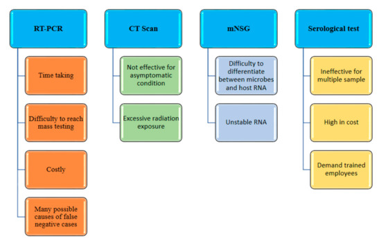 The mNSG techniques are used for the viral detection. The transcriptomes can give ideal information on the gene expression and post transcriptional variations of SARS-CoV-2. For categorizing SARS-CoV-2, a small sample size of primer metagenomic sequences have been used [27,28]. It is a convenient method for detection, as it can classify rarely expressed genes, and detect the process of biosynthesis using the whole meta-transcriptome (thereby including non-coded RNAs). However, this technique also has several disadvantages—for instance, unstable mRNA can decompose the sample before sequencing, and also, the RNA of microbes and the RNA of host cells can be laborious to differentiate [21,29].