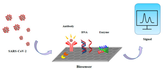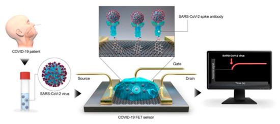 Moreover, graphene-based biosensors are useful for testing and advanced detection of blood glucose, respiration rate, real-time body temperature, blood pressure, virus, small molecules, protein interactions and allergen sensing [104,105]. For biosensors, graphene-based nanomaterials are the most attractive materials to come out in the last few decades due to their cost-effectiveness, high affinity and ease of fabrication [106,107,108]. Recently, a transistor-based biosensor has been successfully developed that detects SARS-CoV-2 (spike protein). The biosensor was fabricated using coated graphene sheets of field-effect transistor (FET) with a specific antibody (Figure 9) [109]. For capturing viruses, graphene and its derivative show good integrity [110,111]. FET-based biosensing devices have advantages over other diagnostic methods which are available currently. They have the potential to make highly sensitive and instantaneous measurements by using small amounts of analytes [112,113]. FET-based biosensors are known for having potential and utility in clinical diagnosis, on-sight detection and point-of-care testing. To detect SARS-CoV-2 RNA in human throat swab specimens, an unamplified and rapid nanosensing platform was developed. A graphene field-effect transistor (G-FET) sensor was developed which was gold nanoparticle (AuNP) decorated. On the surfaces of AuNPs, complementary phosphorodiamidate morpholino oligo (PMO) probes were immobilized. This sensor leads to a low background signal, as the PMO is highly sensitive to SARS-CoV-2 RdRp [114]. When a graphene field effect transistor is coupled with a CRISPR-Cas9-based biosensor, it will be able to detect unamplified target genes, and thus, it could be considered for viral target, such as of the nucleic acids of SARS-CoV-2 [115,116].
