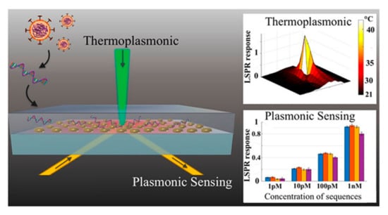 Furthermore, localized surface plasmon resonance (LSPR) biosensing systems consist of optical biosensors which are suitable for various classes of analytes of clinical interest [80]. Molecular binding and refractive index change LSPR sensing systems exhibit high sensitivity to local variations, owing to the enriched plasmonic field in the locality of a nanostructure [81]. Thus, for label-free and real-time detection of micro and nanoscale analytes. LSPR is an ideal candidate [82,83]. A promising and alternate solution for COVID-19 diagnosis is provided by a dual-functional plasmonic biosensor linking LSPR sensing transduction and the plasmonic photothermal (PPT) effect (Figure 6). Through nucleic acid hybridization, one can perform sensitive detection of select sequences from SARS-CoV-2 using two-dimensional gold nanoislands (AuNIs) functionalized with complementary DNA receptors. With the two-dimensional distribution of nanoabsorbers, (AuNIs), the plasmonic chip is capable of transducing via in-situ hybridization and generating the local PPT heat for highly accurate and sensitive detection of SARS-CoV-2 [84]. A quick immunoassay for instantaneous recognition of antibodies against COVID-19 nucleocapsid protein (Nuc) and three COVID-19 spike protein antigens (receptor binding domain, RBD; spike S1 fragment; spike S1S2 extracellular domain) is provided by a multiplexed grating-coupled fluorescent plasmonics (GC-FP) platform. Using serum, it reached 100% sensitivity and specificity for detecting prior COVID-19 infection, and for dried blood spot samples (DBS) it showed sensitivity as high as 86.9% and 100% specificity [85]. Moreover, an optomagnetic biosensor which is based on homogeneous circle-to-circle amplification (HC2CA) [86] was applied for the detection of synthetic complementary DNA (cDNA) and RNA-dependent RNA polymerase (RdRp) coding sequences of SARS-CoV-2, having a limit of detection at the femtomolar level [87]. Hence, this can be fabricated for the detection of SARS-CoV-2 in the air and in real time.