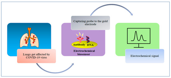 Additionally, for the selective detection of reactive oxygen species (ROS) in sputum samples, a simple electrochemical sensor was designed. It is made up of a disposable sensor and an electrochemical board which gives an output automatically. The sensor consists of multi-walled carbon nanotubes (MWCNTs) which are on the top of the steel needles in a triangular structure of three electrodes which are 3 mm from each other—namely, the reference, counter and working electrodes. It detects the ROS level in the sputum of a COVID-19 infected patient as an indicator or lung dysfunction which is induced by the virus’s forcing of mitochondrial ROS overproduction (Figure 8) [98].