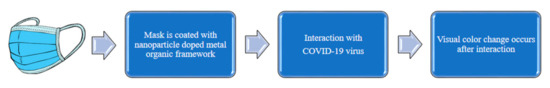 In traditional laboratory-based diagnostic tests, laborious sample processing procedures were involved. To encourage non-invasive measurements, continuous monitoring and more efficiency, recently, wearable sensors have been getting more consideration [130,138,139]. As compared to blood, biological samples such as tears and sweat may have more selective detection. For addressing mass-level screening, wearable sensors are efficient and offer point-of-care diagnosis, which is important in the prevention of wide expansion of a disease [100]. Before the appearance of clinical symptoms of COVID-19, an android and some wearables could predict the alterations in physiological status [140]. Researchers have created a software-based monitoring system which can be used to detect COVID-19 by considering respiratory and heart functions, as these are highly related to infection with this virus [141,142]. This software-based sensor uses skin fit wearable devices, such as electrocardiogram (ECG) sensors for diagnosis of heart function, and pulse oximeters for the diagnosis of shortness of breath and oxygen saturation levels of the patients [143]. Additionally, an increase in the usage of smart watches, including WHOOP, Fit bit, VivaLNK and Amaze fit etcetera, is noticeable these days. For the purposes of measuring temperature, heart rate and blood pressure, these wearables (optical sensors and accelerometers) can be used [144]. For complete measurements of body temperature, respiration related features and heart activity-related vital parameters (heart rate, heart sound and cardiac amplitude), a chest mounted patch sensor was developed by Rogers and his group, in collaboration with the US Department of Health and Human Service’s Biomedical Advanced Research and Development (BARDA) and Sonica Health. The patch sensor is put in direct contact with the skin at the base of the neck, and it includes a temperature sensor and an accelerometer. With 50 subjects, the initial phase of testing the patch sensor was carried out, and the aftermath was that the changes in the respiratory parameters were related to each other, so it made it easy to know the prognosis of COVID-19 infection [145]. Further, the patch sensor provides more coziness to the patient, and this encourages applications of it in mass-level testing. For early detection, a face mask for sensing applications could be vital. To deal with SARS-CoV-2, wearable masks were made with a metal–organic framework that displays changes in color. Chemisorption or physisorption was utilized when nanoparticles were doped in a nanoporous matrix, such as a metal–organic framework (MOF). Then the doping of nanoparticles was performed. Due to changes in optical properties when nanoparticles interact with the virus, as the outcome, there is a visible color change (Figure 10) [146]. Moreover, a functionalized immunosensing chip with specific monoclonal antibodies in opposition to SARS-CoV-2 spike protein [147] can be used, but the current immunosensors are not suitable due to the small size of SARS-CoV-2 (around 100 nm): the viral particles cannot contact the surface of sensor in the low-Reynolds-number hydrodynamic conditions [148]. Smart nanostructures can be used to detect the virus in environmental air samples due to their large surface areas [149,150,151,152,153,154,155]. It has been proven that SARS-CoV-2 can spread through breath [156]. Hence, intelligent face masks are being developed, where a high density of conductive nanowire arrays equal in size to the virus, a miniaturized impedance circuit and a nanoimpedance immunosensor are implanted. Nanowire arrays are attached to the face mask via a flexible plastic polymer constructed with a nanoscale soft printing mechanism, which decreases its cost. When viral targets are detected through biological components, impedance signals will be changed, and a wireless signal will be transmitted to a smartphone through Bluetooth and a miniaturized impedance circuit. The face mask as a POC tool is used as a source of viral samples. In this case, it has highly concentrated nanowires to effectively catch and accumulate the exhaled viral aerosols. In simulated breath aerosols and with a diluted aqueous solution, the POC device was used to identify spike proteins and intestinal flu virus (coronavirus mimics). With the use of nanowires, there are advantages such as ultra-low power consumption; small size; rapid response; high sensitivity; and being non-hazardous, easy to use, non-invasive, stored well and not that costly. For the management and detection of respiratory infections, a sensitive and affordable POC tool was provided as a combination of nanoscale sensors and a face mask [157].