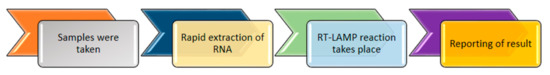 The loop-mediated isothermal amplification (LAMP) technique has been used for the detection of COVID-19 (Figure 12). This technique amplifies the desired gene sequences in isothermal conditions, whereas PCR amplifies the genes at various temperatures, which limits its applicability for resource-limited laboratories. Additionally, a reverse transcription-loop mediated isothermal amplification-nanoparticle-based biosensor (RT-LAMP-NBS) was developed by using colorimetric sensing nanoparticles for visual detection, and it offers effective and easy use for clinical laboratories. This apparatus requires a heating mantle to maintain a steady temperature of 63 °C for around 40 min, and its working features include two LAMP priming sets, nucleoprotein (NP) and F1ab (open reading frame (ORF) 40 1a/b) of SARS-CoV-2. The one-step RT-LAMP reaction amplifies and identifies two target genes (np and F1ab) at the same time, which adds more precision in the result. Thus, the complete procedure for diagnosis, from the sample collection to the result evaluation, takes around 1 h. It was experimentally found that oropharynx swab samples are effective for providing precise results, as they gives 12 copies per reaction in the case of SARS-CoV-2 templates, whereas non- SARS-CoV-2 templates do not allow cross-reactivity. Hence, this method can be used as a diagnostic tool for COVID-19 because of its sensitivity, simplicity, high precision and cost-effectiveness [21].