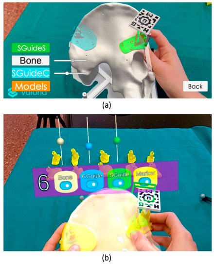 Two software applications were developed to display the virtual models with AR, one to be deployed in a smartphone (Figure 2a) and a similar one for the Microsoft HoloLens 2 device (Figure 2a). Both applications were implemented on Unity platform (version 2019.3), using the Vuforia development kit (Parametric Technology Corporation Inc., Boston, MA, USA) for pattern recognition. Details regarding the development of an AR app for these purposes have been previously described by Moreta-Martinez et al. [32]. The applications included a menu to select the case and buttons to change the visibility and opacity of each model. In the smartphone app, this interaction was done on the screen. For the HoloLens 2, an interactive panel was shown in front of the user. The applications included the visualization of virtual models of the PSIs for that specific case, as well as a model of the bone. The idea was to adjust the placement of S PSIs using the bone model as a reference. Once fixed, the planned position of C PSI would be displayed and used as guidance. The steps followed for AR guidance are therefore the following:
