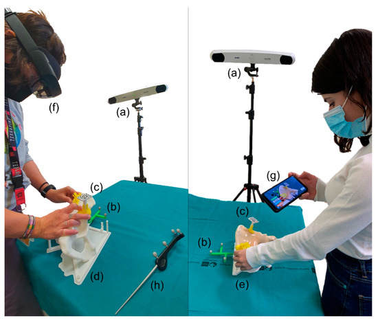 Setup for the assessment using (left) the HoloLens 2 and (right) the smartphone. The setups include the following elements: (a) optical tracker, (b) reference frame, (c) AR marker placed in PSI, (d) conventional, and (e) realistic phantom versions, (f) HoloLens 2, (g) smartphone, and (h) pointer.