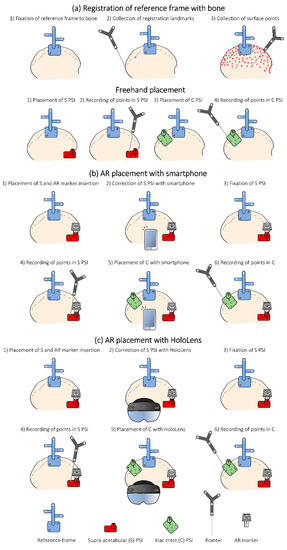 Steps followed during the experiment for registration and to record PSIs placements in each methodology. (a) Registration of reference frame with bone, (b) AR placement with smartphone, and (c) AR placement with HoloLens.