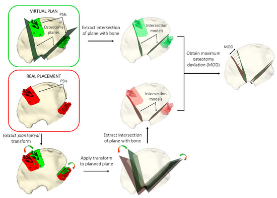 Computation of the maximum osteotomy deviation (MOD) between planned and real osteotomy planes. The real osteotomy is defined by the PSI placement performed by the user.