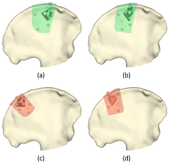 The shape, size and location chosen during PSIs design have shown to be highly relevant factors to consider for minimizing placement errors. In our study, those cases presenting both small size and homogeneous target area exhibited significantly higher errors than those with larger sizes and a more distinct target surface. However, the available target area may be limited depending on the surgical case, leaving no choice but to choose a homogeneous surface. Regarding size, although larger designs are easier to install in the correct location, they are also more invasive [8,35]. Hence, a trade-off between ensuring precision and reducing invasiveness should be found.