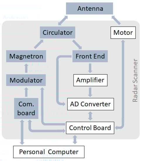 Main parameters of the coherent on receive radar scanner. All components used from the original scanner unit are marked in grey boxes.