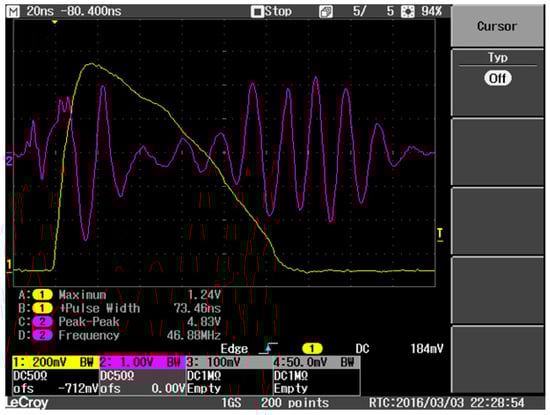 Measurement of the radar pulse (yellow line) and intermediate frequency of the signal at the front end. In this case the pulse width is approximately 73 ns giving an acceptable power and pulse shape.