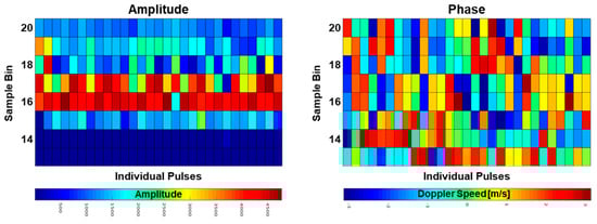 Due to the construction of the radar, there is a time delay between the transmission of the pulse and the start of acquisition of the ADC. To estimate this delay, the first digitized bins (where the transmitted signal is stored) of a series of individual pulses (≥256) are investigated with respect to finding the bin with the mean maximum intensity. This bin contains most of the energy of the transmitted pulse and therefore the best phase information. This procedure is performed in post processing as the bin number can differ between radar systems. In Figure 4 an example of the digitized bins 13 to 20 are plotted for 29 pulses, which result from the transmitted pulse leaked through the circulator. In this case the bin with the maximum mean amplitude is bin 16 (left hand side), so that the reference phase of the transmitted pulse is at bin 16 (right hand side).