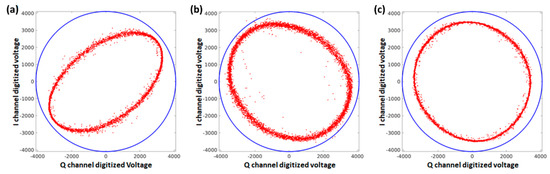 To get the cleanest possible signal, the gunn diode within the radar front end has to be fine tuned with regards to the intermediate frequency (IF). The IF must be tuned to the radar internal resonance frequency. To perform this tuning the I and Q-channel of the digitized transmitted pulse is investigated with respect to the I Q balance [28]. The ideal tuning is reached when the I and Q channels are located on a perfect circle on the I Q scatterplot (Figure 5c), which means that the amplitudes in the I and Q channels are identical, and both channels are shifted by 90°. Tuning the IF off the radar internal resonance frequency, generates an extra phase shift, producing an elliptical shape on the I Q scatterplot (Figure 5a,b).