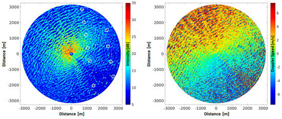 Radar intensity (left) and Doppler speed (right) image resulting from one single antenna rotation (at 0.6 Hz) from the MR operated at the Research Platform FINO-3, located in the German Bight of the North Sea. The data were collected on 29 October 2017 at 11:54 UTC utilizing horizontal (HH) polarization.
