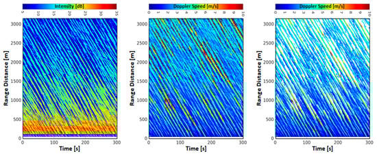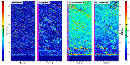 At the Sylt station, the radar was operated in the static antenna mode with a HH-polarized antenna, which was changed after one hour to a VV-polarized antenna. During this time period the weather situation was fairly constant with wind speeds of approximately 16 m/s from the west (measured at the station) and waves coming from the west with a peak period of 8 s and a significant wave height of approximately 2.7 m (measured by a directional waverider 1.3 km west of the station). Figure 9 show the Intensity for HH- and VV-polarization respectively. It can be seen that the radar backscatter intensity of the VV-polarization is slightly higher than HH-polarization, which is well known for moderate incidence angles [36]. Furthermore, the waves are imaged with much more clarity in the VV-polarization, which is due to the scattering mechanisms, as HH-polarization is more strongly influenced by wave breaking. The differences between HH- and VV-polarization are significant in the case of the Doppler speeds. The mean Doppler speed is much larger in the HH-polarized data, which is due to the higher sensitivity of HH-polarization to wave breaking [37,38]. Therefore, the Doppler speeds in VV-polarization are much better suited for retrieving the orbital motions of waves or mean surface currents.