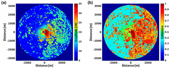 Marine radar measurements of sea ice at VV-polarization in the Fram Strait, acquired from the RV Lance on 3 September 2015 at 14:00 UTC. At the time of acquisition, the vessel was moored to the huge ice float to the east. The amplitude (a) and coherence (b) were retrieved from 50 rotations (100 s).