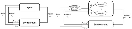 Illustration of the main differences between Reinforcement Learning (RL) (left) and Multi-Agent Reinforcement Learning (MARL) (right) (adapted from [38]). The figure represents the dynamics of a RL and MARL systems at a given time step t.