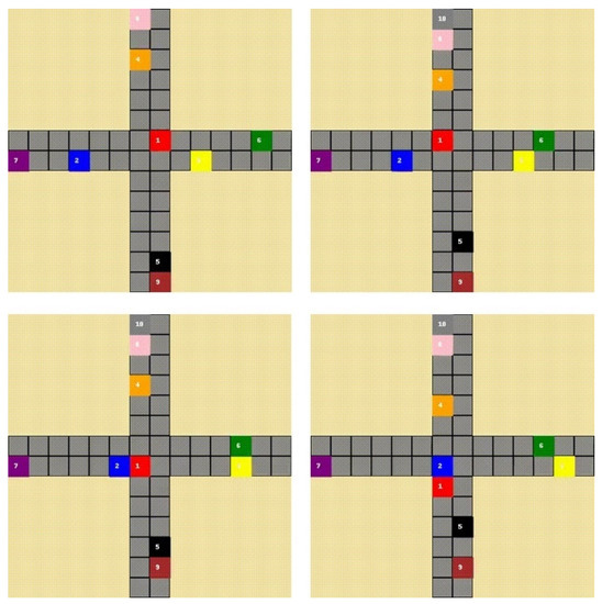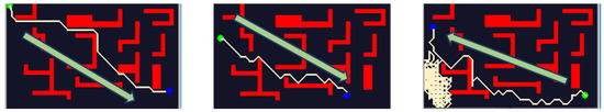 Figure 7 illustrates the adaptability problem of the Q-learning based path planning model. One of the significant drawbacks of this method is the lack of generalisation; the agents learn the detailed path of the training route. Our test results show that the model tends to always travel in the direction of the training route without considering the target position. For instance, we trained the model from the top left corner start point to the bottom right corner of the destination.