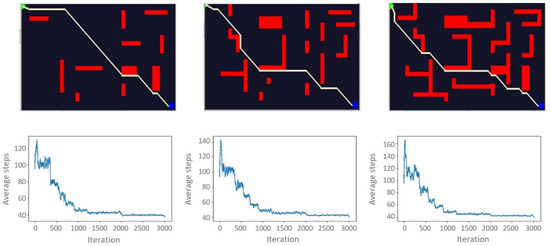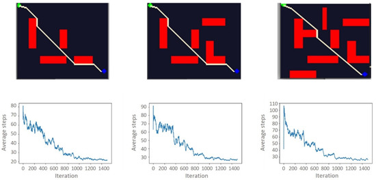 This experimental setup is designed to examine the impact of the environmental complexity on path planning algorithms using RL or, more specifically in this case, Q-learning. Hence, we experimented with six different environments with different complexity configurations, with a 100 × 100 and 200 × 120 grid world systems. Figure 5 and Figure 6 illustrate the 100 × 100 and 200 × 120 grid world systems, respectively. The model was firstly trained in an accessible environment and then is followed by a moderate and a highly complex setup. As illustrated in Figure 5 and Figure 6, based on the complexity of the environment, the model took a different number of iterations to converge. However, we have not found a significant time difference between easy, moderate, and hard configurations for the same environment. Hence, the results suggest that changing the experimental environment to a more complex one will increase the training time more than just adding obstacles to a fixed environment. As the number of obstacles increases, the learning time will also increase.