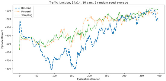 Traffic junction performance using no curriculum, a forward curriculum, and a sampling curriculum.