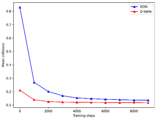 Collisions for the simulation environment described for DQN and Q-table approaches.