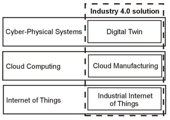 The development of Industry 4.0 systems is based mainly on IT solutions dedicated to production and in-house logistics [11]. These technologies constitute adaptations of native information technologies to industrial requirements and combine, in an interdisciplinary fashion, production engineering, IT systems, mechatronics, communication technologies, and data analytics [12]. The assumptions of Industry 4.0 are a set of functionalities of these information technologies, selected and combined as required by a production company’s business needs (Figure 1). As they are implemented in Industry 4.0, these technologies are given specialist names, such as Industrial Internet of Things, Cloud Manufacturing, or Digital Twin. Coupled together, they create Industry 4.0 solutions [13].