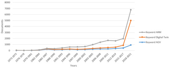 Number of publications regarding digital twins, AMR, and AGV according to the Scopus database.