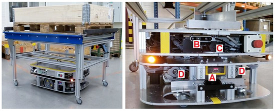 The prototype of autonomous mobile robot under the transport trolley (left). Main sensors of the robot (right): A—safety laser scanner, B—stereo vision 3D camera, C—high definition 2D camera, D—motor incremental encoders.