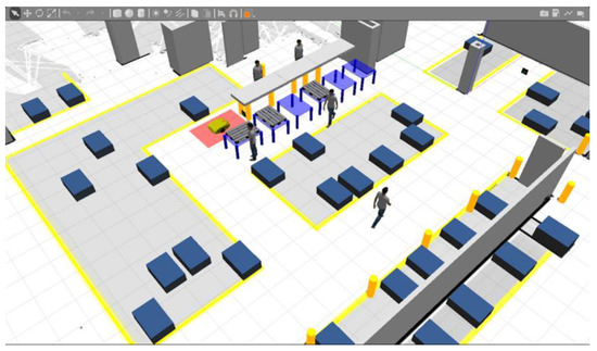 Figure 5 shows a visualization of a fragment of the digital twin of the shop floor created in the Gazebo simulation environment. The model incorporates fixed elements (walls, columns, racks, roller conveyors), box-pallets in storage areas, and the figures of employees. These components are important from the point of view of the operation of the simulated vehicle’s sensors and the robot’s localization and navigation algorithms.