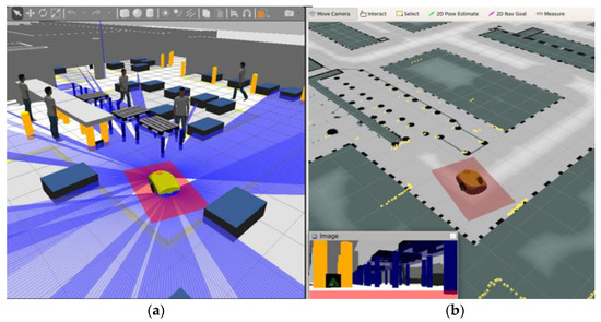 Yellow dots in Figure 6b visualize the results of measurements of the distance from objects detected by the robot’s digital twin’s virtual laser scanners. The digital model of the laser distance meters takes into account the random nature of the variability of the measurement results (characterized by a given normal distribution). It should be emphasized that the vehicle’s position and orientation on the occupancy grid (i.e., in the global reference frame of the shop floor—Figure 6b) are estimated by the AMCL algorithm and may therefore be burdened with error. In the bottom left corner of the RViz window, one can also see the image of the vehicle’s operating environment from a simulated camera installed on the front end of the robot’s digital twin.