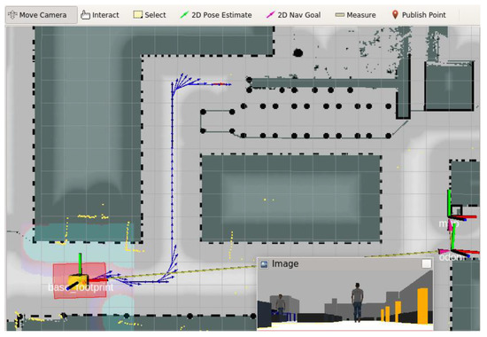 Figure 6b shows a window of the RViz program designed for visualization and monitoring of the operation of robotic systems and their control algorithms. RViz is part of the Robot Operating System (ROS) middleware suite [44]. The window shows the model of the AMR against the background of an occupancy grid—the areas in the plane of the shop floor shown as a grayscale image. The black pixels on the occupancy grid indicate the forbidden zones, which the vehicle cannot enter. Grid pixels with a shade closer to white will be preferred by the navigation algorithms during path planning.