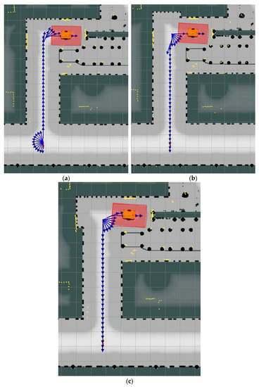 The digital twins of the AMR and its operating environment described in this paper were used extensively during the development, improvement and testing of the robot’s on-board localization and navigation systems. Figure 7 shows the path, planned by the navigation algorithm, leading to the docking station located at the end of the roller conveyor (at the top of the figure). The path runs along a safe corridor between prohibited areas which the robot is not allowed to move in. The simulations demonstrated that, despite the fact that the corridor in which the robot was allowed to move was relatively narrow relative to the size of the protected zone around the vehicle, the robot did reach the given docking position. However, the next simulations showed that the robot could only complete the return path by driving backwards—Figure 8a (here, the vehicle is in its initial pose) even though the planning algorithm preferred driving in the forward direction. Unfortunately, the corridor was too narrow for the robot to turn around on the spot.
