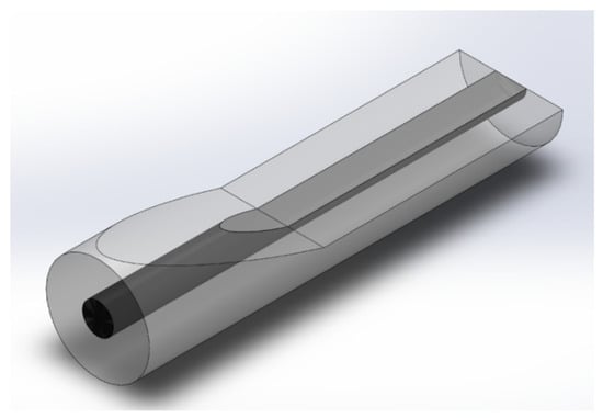 For the second light coupling, a tapered SCF is polished at a certain waist location as shown in Figure 1 but magnified in Figure 2 to create a DSCF in which slot waveguides are built in the flat silicon region to serve as an in-line fiber-based biosensor. An SCF can be tapered to the desired diameter by using, for example, an oxyhydrogen flame system. The tapered SCF is then fixed on a V-groove whose depth is designed to achieve the polished depth of a DSCF. The flat platform of the DSCF is generated by using a grinding wheel system for precise polish depth control. Afterward, the narrow slot can be fabricated in DSCF by using electron beam or helium beam lithography for patterning and followed by reactive ion etching.