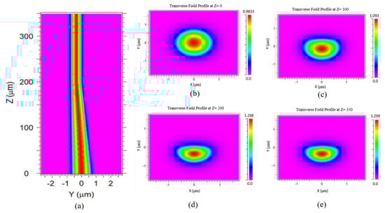 (a) The evolution of light field propagating through the DSCF y–z-plane, and light field of x–y-plane at (b) z = 0 µm, (c) 100 µm, (d) 200 µm, and (e) 350 µm.