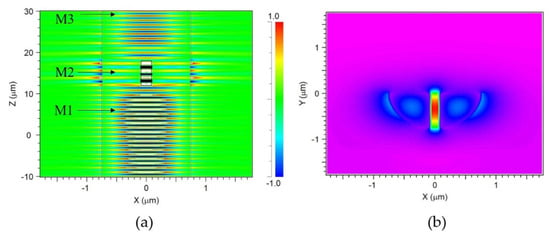Rsoft Beamprog. was used to confirm that the guided core mode in the DSCF could be coupled into slot mode of SW in DSCF. The simulation model of a slot waveguide built in a DSCF and the cross-section of the slot region are shown in Figure 4a,b, respectively. The core diameter was 1.5 µm and the depth of SW was around 0.75 µm. Figure 5a shows that the electric field distribution of incident light propagating through the SW in the DSCF. Note that light was indeed coupled into the slot waveguide with 140 nm width inside the DSCF as shown in Figure 5b in which the field distribution was recorded by monitoring M2 along xy-plane. Figure 6 shows the evolution of norm electric field. The red, blue and green curves were the monitored values at locations M1, M2 and M3, respectively. It is clearly seen that the initially guided mode ( increased significantly when coupled into the slot mode, from 0.4 to 4.7 at steady state, indicating the electric field enhancement in the SW region. The result was consistent with the theory that the norm electric field amplitude of slot mode could be 11 times larger than that of the guided mode because (), where is the norm electric field in the SW region and . is the norm electric field in the silicon core.