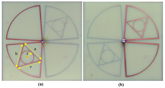 A circle is inscribed in the triangle where the triangle’s three sides are all tangents to the circle. As the triangle’s three sides are all tangents to the inscribed circle, the distances from the circle’s center are equal to the radius. The radius r of the inner circle is calculated in such a way that it is equal to the height of the triangle. The unequal length of the arms a, b, and c of both front and back-sided triangles is shown in Figure 2a. The minimal resonate frequency of the proposed multi-band bow-tie antenna is identified by the length of the dipole, which is equal to λ0/4 in length. In Figure 1c, the minimum resonant frequency of the self-complementary dipoles (length 69.00 mm) is nearby 1 GHz, while the resonance frequencies cover between 800 MHz and 2.7 GHz. But due to impedance mismatch, the available frequency bands within the range of 0.5 to 3 GHz are not covered as well as the average level of simulated return S11 loss is about −7.25 dB for the fifth resonance band. In order to increase the value of the scattering parameter of the proposed bow-tie antenna, the diagonal set of dipoles are modified with a triangle inside a circular shape which is connected to a novel co-axial feeding that can produce the dual circular polarized radiation field to progress the performance parameters of self-complementary new dipoles structure.