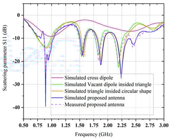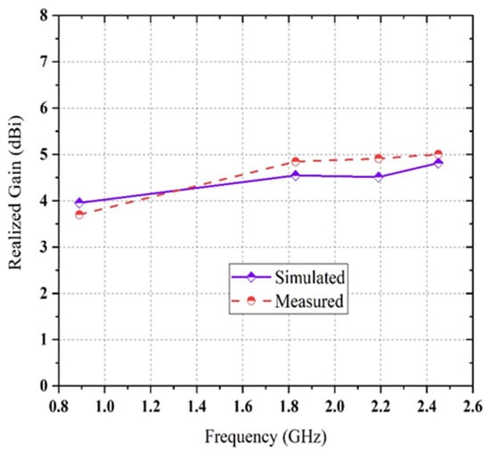 The dual pairs of the cross dipole are connected by a 50 Ω co-axial feeding in the center of the antenna to generate a 90-degree phase delay and form the right-hand circular polarization radiation field and left-hand circular polarization radiation field in front and backside of the antenna, respectively in Figure 1d. It is noticeable that impedance matching can be achieved by using the co-axial feeding technique. The average signal level of the simulated scattering parameter (S11) beyond the bandwidth has been developed from −9.2 dB to −20 dB. Moreover, a triangle with 2.5 mm wide arms is designed inside the dipoles on the substrate to cover the frequency bands lower than 1 GHz. The single complementary sets of modified dipole structures are situated in a diagonal position of the proposed antenna. The measured S-parameter of the proposed antenna is showed in Figure 3. It has been shown that the comparison between simulated and measured s-parameters of the proposed antenna is good in agreement. A circular shape is designed inside the triangle on both the front and backside of the printed circuit board (PCB) board to occupy the last target frequency band. In order to fulfill the condition for circularly polarized radiation pattern (Figure 4) and improve the impedance matching of the bow-tie multi-band antenna, the single complementary pair of the vacant dipole in a single diagonal position and another single pair of modified dipole structure in other diagonal position is placed both upper and bottom layer of the substrate. Figure 5 shows the simulated and measured evaluation of the realized gains along with the frequency band of the proposed bow-tie antenna. The measured realized gain has achieved a higher gain than the simulated gain in the band of 1.83, 2.19, and 2.45 GHz, except for the band of 0.89 GHz.