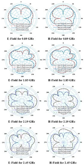 Simulated and measured 2D E and H-field radiation patterns for different frequency bands such as 0.89, 1.83, 2.19, and 2.45 GHz.