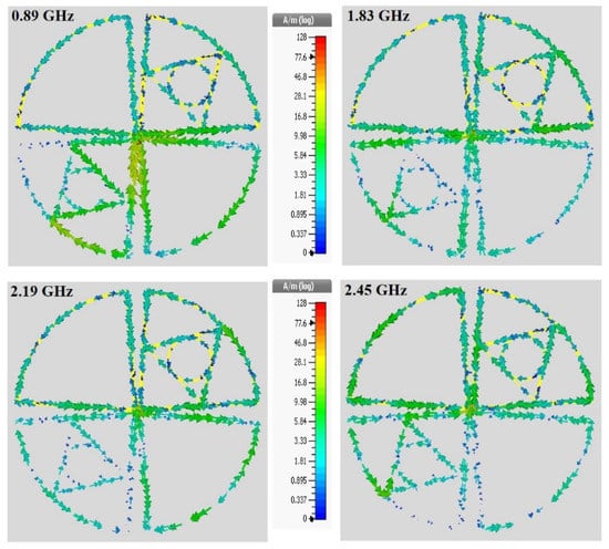 The surface current distribution at the different frequency bands (i.e., 0.89, 1.83, 2.19, and 2.45 GHz.