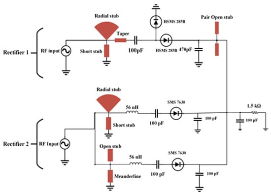 In order to achieve good balancing between antenna and rectifier and mitigate the circuit complexity, a dual-port quad-band rectifier is designed to harvest the RF energy with low power RF density level from the ambient environment. In Figure 7, the second rectifier is a modified half-wave Greinacher rectifying circuit, and the first rectifier (Figure 8) is a conventional voltage doubler rectifying circuit. With the combination of rectifier circuits 1 and 2, the proposed dual ports rectifier circuit is able to cover the available frequency bands (i.e., GSM 900, GSM 1800, 3G, and Wi-Fi). By optimizing every branch of the rectifier 1 and 2, the RF-to-DC rectification efficiency is better tuned in receiving a local maximum for every sub-frequency band of interest. The topology of the suggested rectifier is depicted in Figure 9. The performance parameters of the dual-port rectifier are optimized to attain the maximum RF-to-DC rectification efficiency for all existing frequency bands with associated RF input power density levels of −30 to −20 dBm. Advanced Design System (ADS) v19 is used to design the quad-band rectifier. The connection of two antennas with two ports of the proposed rectifier is not a promising technique for achieving better efficiency because of its relatively small impedance bandwidth and impractical configuration. Due to the frequency-dependent input impedance of the Schottky diode and the narrow BW performance of common impedance matching networks, it is difficult to achieve large-signal input matching overall available frequency bands, which is crucial to assure the maximum power absorbed by the load. From the literature review of [8,19,35,36]), single branch multi-band rectifiers are not able to guarantee the coverage of the available, expected frequency bands while allowing for very low ambient RF power operation. To achieve a high RF-to-dc rectification efficiency of the rectifier over all the frequency bands, two single series diodes have been selected to connect with impedance matching network in parallel, in such a way that each of them operates in a wideband [37], effectively adjusting the overall frequency band. The scattering parameter files supplied for the surface mount device (SMD) inductors by the coilcraft 1080HP series manufacturer are introduced in the ADS schematic to ensure the accurate optimization process.