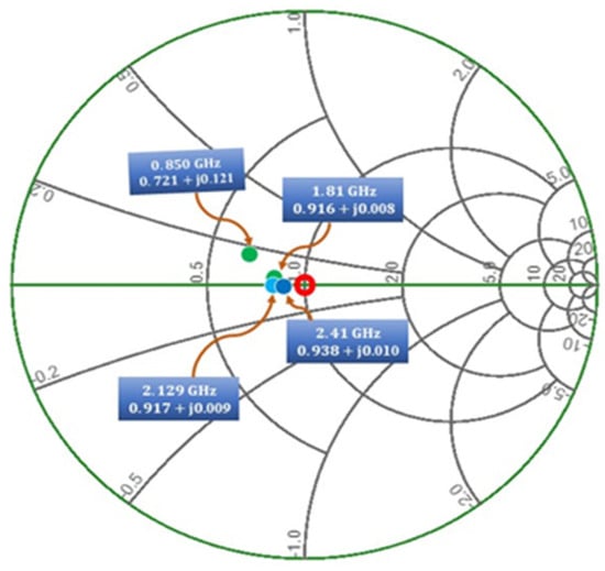 The simulations are conducted by taking into consideration the high-impedance microstrip transmission lines connected to the ground and the S-parameter files of the inductors supplied by coilcraft. Similarly, the first rectifier circuit (voltage doubler rectifier) consists of a matching network between rectifier sections so that it can operate in a low-frequency band. The proposed design is produced for the −20 dBm input power with input impedance of 0.721 + j0.121 @ 0.850 GHz, 0.916 + j0.008 @ 1.81 GHz, 0.917 + j0.009 @ 2.12 GHz and 0.938 + j0.010 @ 2.41 GHz as shown in Figure 10. The rotation of the input impedance is in such a way around the center of the smith chart so that the resonance frequencies outside the expected operating sub-band characterized a high impedance. On the other hand, the operating frequency bands of the dual-port rectifier are slightly affected by its corresponding branch because the rectifier is designed in such a way that the input impedance at each frequency band is nearly placed at the center (50 Ω) of the Smith chart.