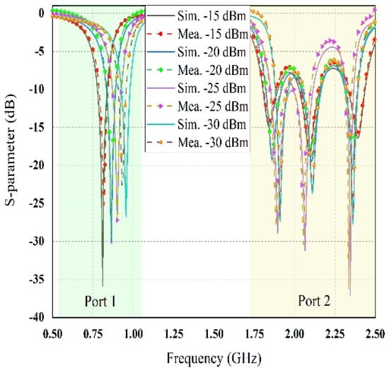 The comparison between simulated and measured reflection coefficient of port 1 and port 2 with the variation of RF power density levels.