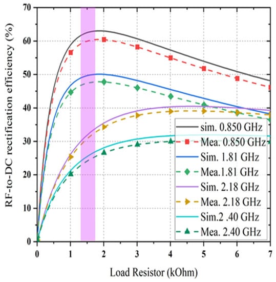 The achieved maximum RF-to-dc conversion efficiency is about 63% at 0.850 GHz for a load resistance value of 1.5 kΩ, as it is considered as a dual-port rectifier load. The optimum load resistance is different for the triple branches of the rectifier, and the value of 1.5 kΩ is selected due to a trade-off intended at enhancing the dc output voltage under the postulation that an identical amount of generated voltage enters each branch of the rectifier at its corresponding central frequency. Moreover, it is illustrated that the dc rectification efficiency of the quad-band rectifier is maintained for a broad range of selected load resistance which is significant in many practical applications. The RF-to-dc rectification efficiency of the dual-port rectifier can be calculated as