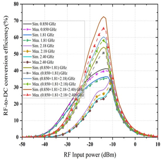 Figure 12 depicts the available RF signal input scattering parameter value at both ports of the proposed rectifier with the variation of ambient input RF power density levels. The reflection coefficient |S11| value of less than −10 dB was achieved across all frequency bands of interest for different RF input powers. It is noticed that the reflection coefficient is shifted from left to right with the decreasing RF input power levels. It also showed a slight difference between simulation and measurement of the reflection coefficient of the proposed dual-port multiband rectifier. The performance of RF-to DC rectification efficiency as a function of different load values is demonstrated in Figure 13 when the input RF power level remains constant at −20 dBm. It is noticeable that the conversion efficiency is greater than 60% at 0.850 GHz, 48% at 1.81 GHz, 35% at 2.18 GHz, and 25% at 2.40 GHz for the load resistor value of 1.5 and 4 kΩ respectively. Comparing the simulated and measured value of conversion efficiency at different frequency bands (i.e., 0.850, 1.81, 2.18, and 2.40 GHz) at −20 dBm RF input power density level shows good agreement.