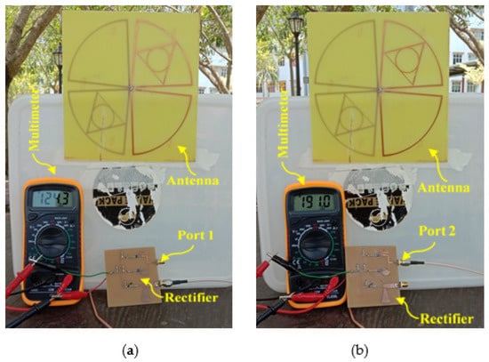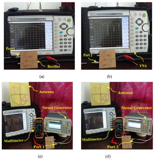 The newly designed multi-band RF harvester was connected to a TSG4104A RF vector signal generator to generate a signal for specific frequency bands (i.e., GSM 900, GSM 1800, 3G, and Wi-Fi) with an associated RF power density level of −20 dB (i.e., minimum ambient RF power level) as input. At first, the separate s-parameter response of the dual-port rectifier (i.e., port 1 and port2) was measured by using the Anritsu MS2024A Master Vector network analyzer (VNA) as shown in Figure 16a,b. Secondly, both VNA and a digital multimeter are used to measure the performance of the antenna and rectifier in the applied lab at MMU (i.e., Figure 16c,d).