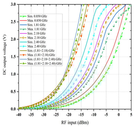 where, is the output dc power in dBm, is the dc output voltage, and is the optimal load resistance. The measured dc output voltage as a function of received RF power density levels for the number of input frequency bands is shown in Figure 17. As shown in Figure 17, the measured output dc voltages are in good agreement with the simulated result. The proposed rectenna does enhance the output dc voltage level as the number of frequency increases. For three consecutive input frequency bands, the measured output dc voltage is greater than the input of single frequency bands. This increase performance is due to an excellent impedance matching between the antenna and port 2 of the rectifier and almost equal to the sum of dc voltage. If some of the incident powers do not have the same dc value, the impedance matching, and hence, the measured output dc voltage is not optimum.