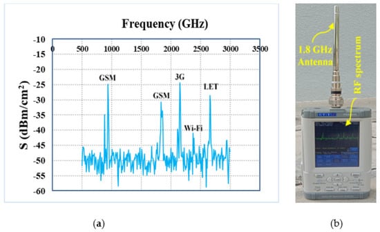 (a) The available frequency bands with associated RF power density levels within the area of MMU campus and (b) TTi PSA6005 spectrum analyzer with calibrated antenna and complete RF spectrum.