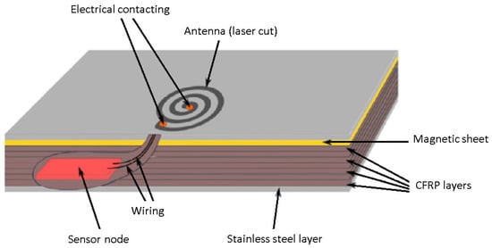 The proposed antenna was cut by lasers into the outer steel layer of an FML structure consisting of CFRP and stainless-steel layers. The sensor electronics were embedded inside the material stack. Figure 1 shows a schematic overview of the concept.