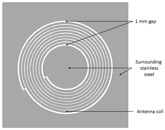 The geometry of the antenna was designed in CAD software using the determined parameters as described above. The remaining areas of stainless steel within and around the antenna structure itself were not included in the above calculations. Due to this approach, the resulting shift in resonance frequency due to parasitic capacitances was compensated by iterative changes on the antenna geometry. A top view of the antenna design is presented in Figure 3. A 1  gap was included around the antenna to reduce the parasitic capacity effects of the surrounding material on the coil as far as possible, as this was the maximal gap taken from project requirements.